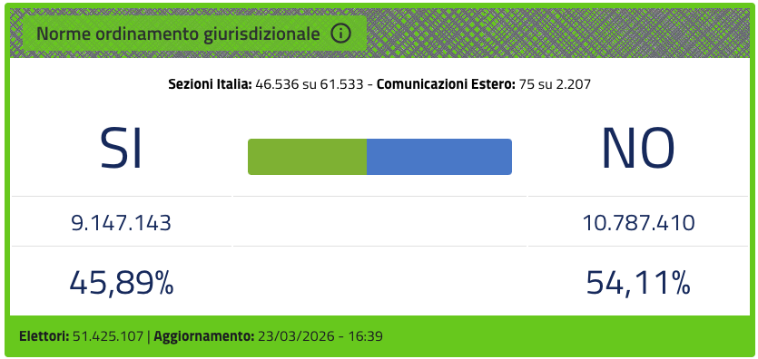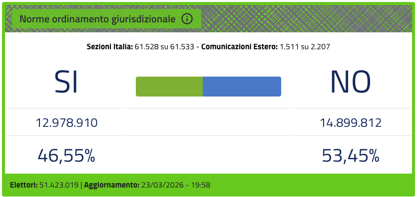 Con quasi tutte le sezioni italiane scrutinate e più della metà di quelle estere già conteggiate, i risultati del referendum sulla Giustizia sono per lo più definiti. Il No ha vinto, con una percentuale vicina al 53,5% dei voti, pari a quasi 15 milioni di persone. Il Sì ha ricevuto quasi 13 milioni di voti, pari a circa il 46,5%.