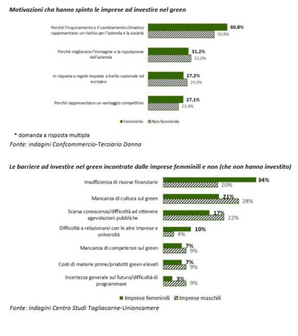 C’è però un problema, ovvero la difficoltà di ricevere investimenti. Un ostacolo che incontra 1 donna su 3 (il 34%) mentre tocca appena il 20% degli uomini (1 impresa su 5). Eppure gli imprenditori hanno una minor conoscenza sul tema ambientalismo e sostenibilità (28% dei casi) rispetto alle donne (21%), così come sulle competenze per accedere a investimenti green (uomini 17% rispetto a donne 22%).