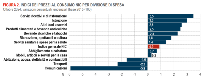 Nel comparto dei servizi, i prezzi aumentano del +2,7%, con un rallentamento rispetto al mese precedente (+2,8%). In particolare, i prezzi dei servizi ricreativi e culturali subiscono una decelerazione (da +4,0% a +3,6%), con un calo dei pacchetti vacanze (da +13,0% a +9,6%). Al contrario, i prezzi dei servizi di trasporto mostrano una tendenza in accelerazione (da +2,4% a +3,0%), soprattutto per il trasporto marittimo (+4,2%) e aereo (+2,5%). L’impatto di questi andamenti sul tasso di inflazione di ottobre è rappresentato dai contributi alla variazione tendenziale dell’indice generale dei prezzi al consumo.