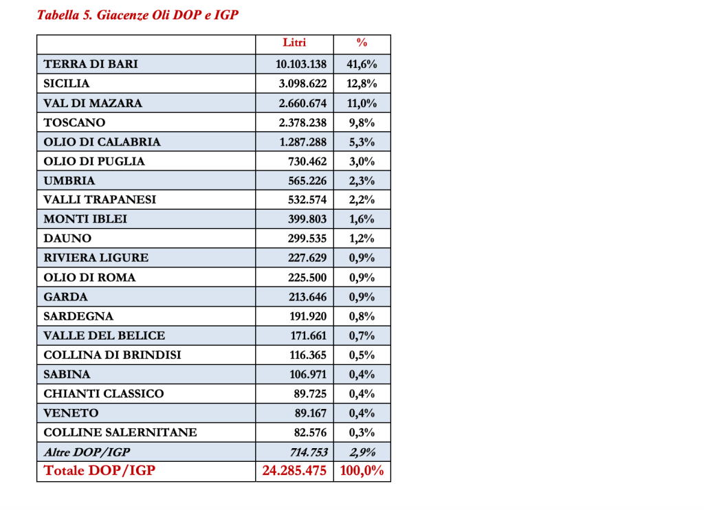 Nel complesso, l’olio a DOP/IGP in giacenza è pari al 9,4% del totale presente in Italia e costituisce il 12,7% dell’olio EVO stoccato.