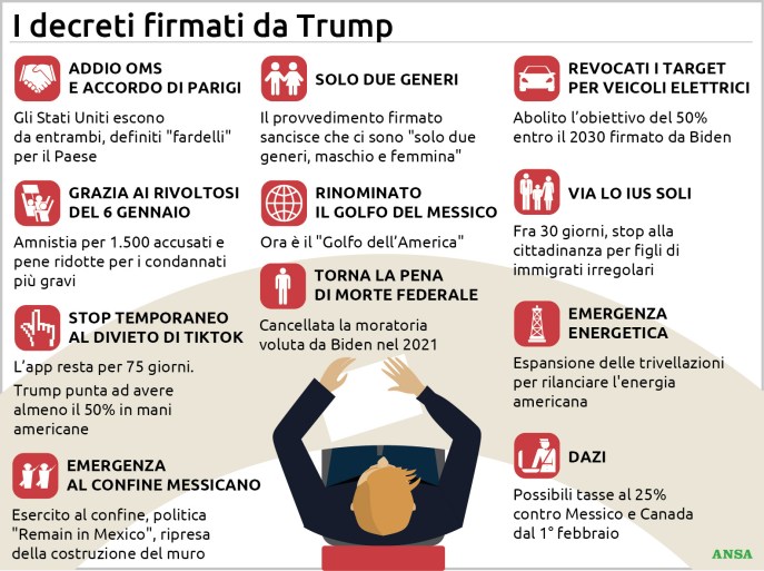A livello mondiale in questi giorni non si parla d’altro, perché le promesse – e le minacce – che ha detto sono tante. Tra le azioni più rilevanti, spiccano provvedimenti sull’energia, l’immigrazione e la politica commerciale. Trump ha annunciato più di cento direttive solo nel primo giorno di mandato. “Vi girerà la testa quando vedrete cosa succederà”, aveva promesso durante la campagna elettorale. E non ha avuto tutti i torti.