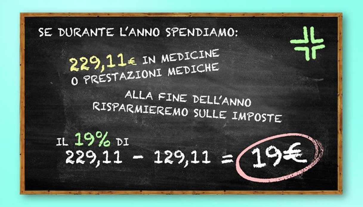 se in un anno spendi 229,11 euro in farmaci o prestazioni mediche, potrai detrarre il 19% di 100 euro (cioè 229,11 – 129,11), risparmiando 19 euro sulle imposte da versare allo Stato.