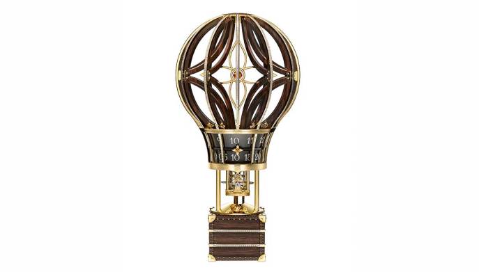 Montgolfière Aéro, due straordinari oggetti d’orologeria sono oggi espressione dell’eccellenza artigiana e creatività unica che oltre un secolo fa hanno entusiasmato Louis Vuitton. Una splendida mongolfiera in vetro rosso e trasparente o in legno pregiato, incorpora un orologio meccanico svizzero.