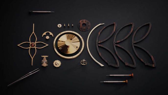 La mongolfiera poggia su un baule Louis Vuitton in miniatura, realizzato a mano con lo stesso savoir-faire della versione originale e completato dagli elementi e i codici di design caratteristici della Maison. Il baule ospita il meccanismo di carica del movimento. Tra i dettagli del segnatempo, un fiore Monogram indica le ore e i minuti, visualizzati su due dischi, superiore e uno inferiore. Al centro del pallone traforato emerge un fiore Monogram Louis Vuitton, mentre la parte inferiore del tronco presenta un altro fiore, che si apre per caricare l’orologio.