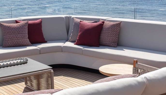 L’eccellenza del Made in Italy è esaltata anche dagli arredi: sedute Ortigia di Flexform, sedia Curve di Poliform, e illuminazione Tropico di FontanaArte per la zona ufficio. Altri marchi presenti sono Fendi Casa, Poltrona Frau, Paola Lenti e De Castelli, il tutto accompagnato dall’illuminazione di Flos, per creare la perfetta atmosfera domestica sullo yacht.